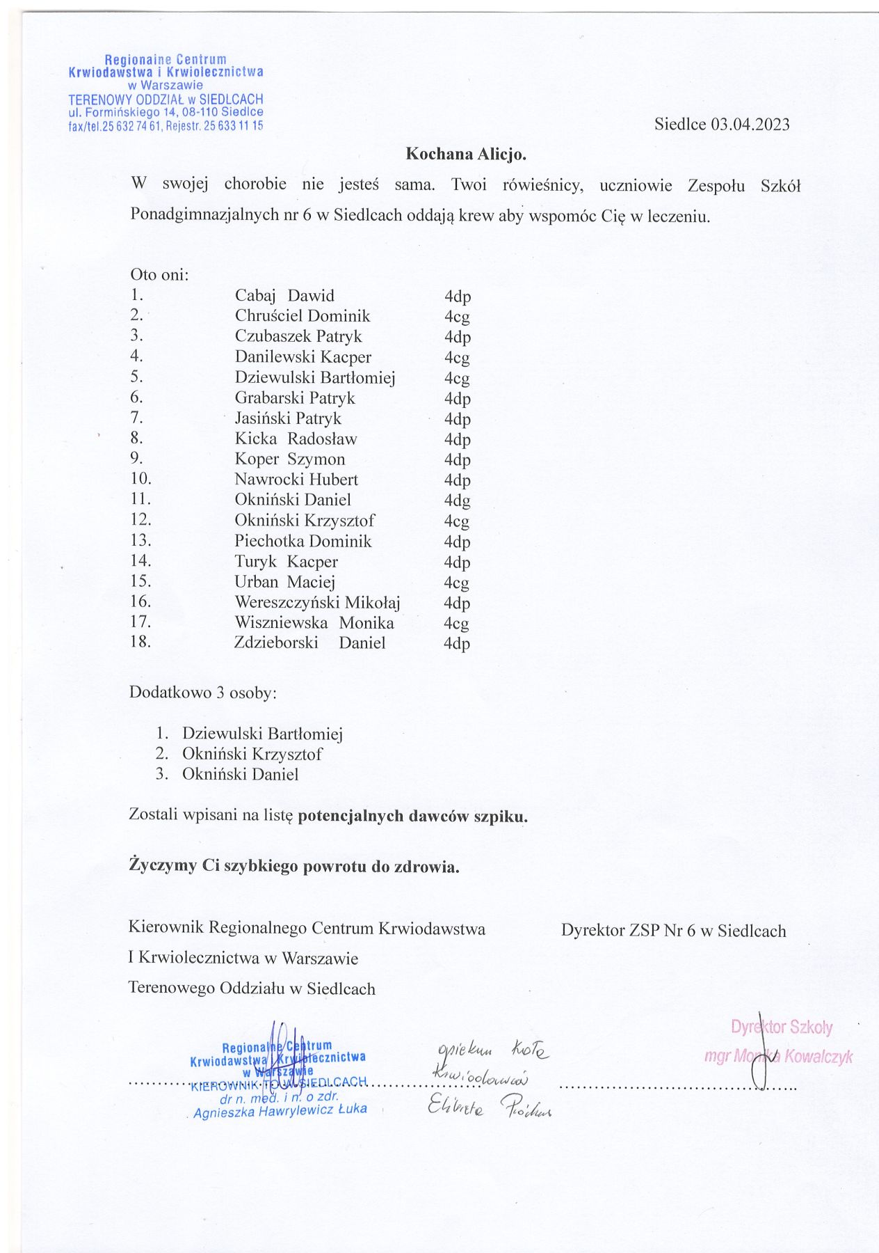 Ponadto 3 osoby zdecydowały się zostać dawcą szpiku.